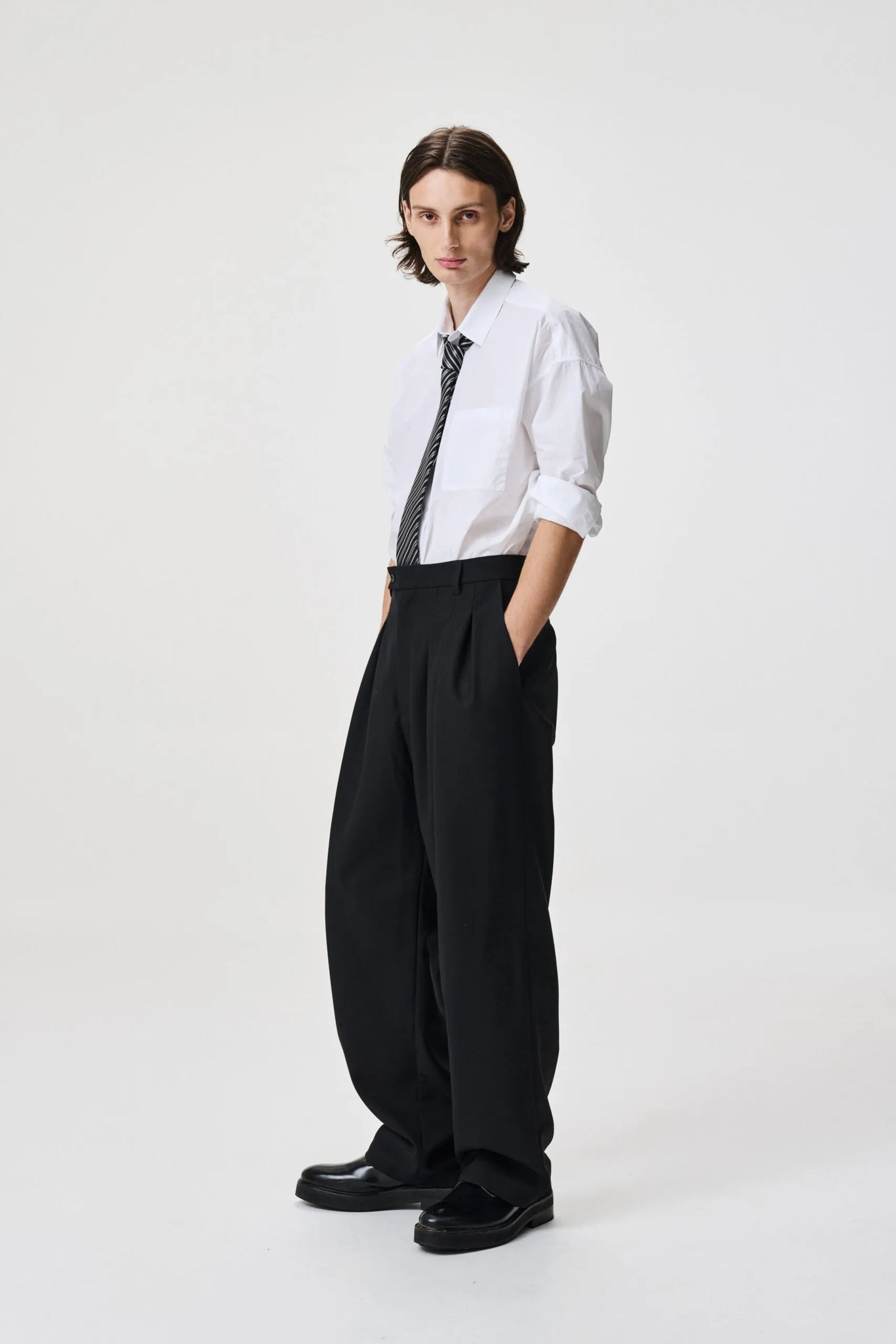 Henry is captured also wearing The Black Maxi Blazer by Studio Cut, The WOMAN Tee and The Long Tie by ADNYM.