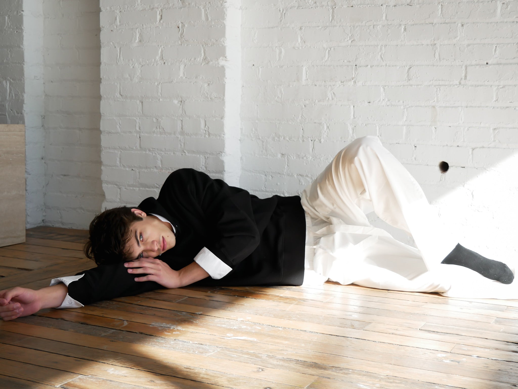 Henry is captured also wearing The Rham Shirt in White by ADNYM and The White Poplin Pyjama Pant by Tekla.
