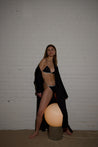 Cydney is captured also wearing The Rosie Silk Bra in Black by Nué.