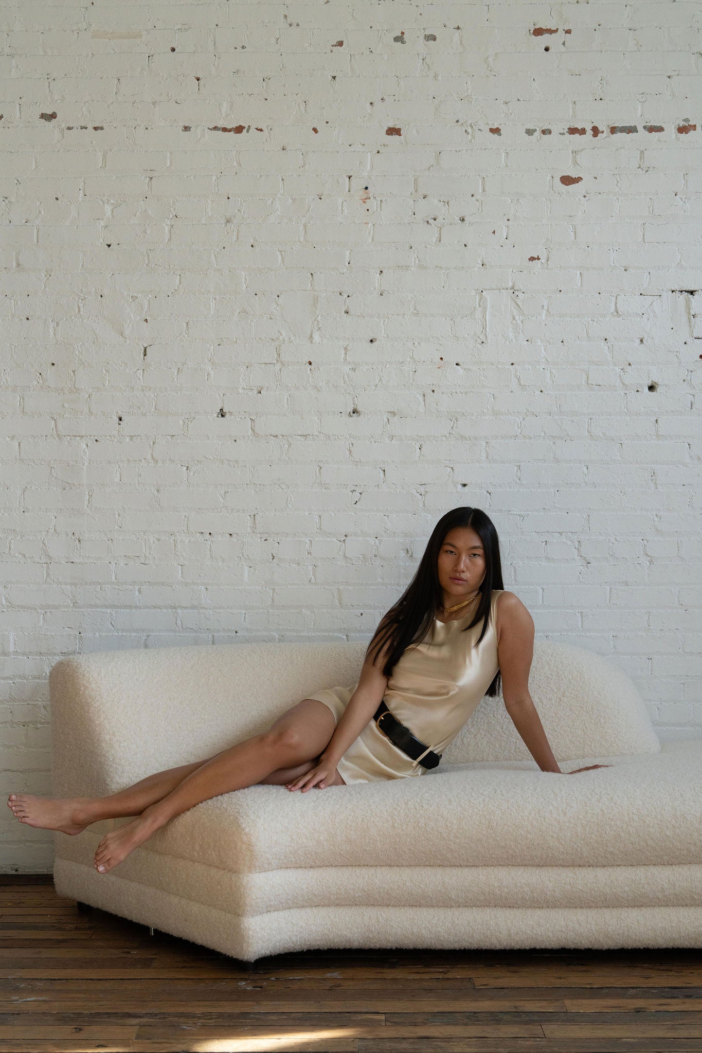 Kayla is captured also wearing The Flat Spikelet Choker in Gold by Bevza.