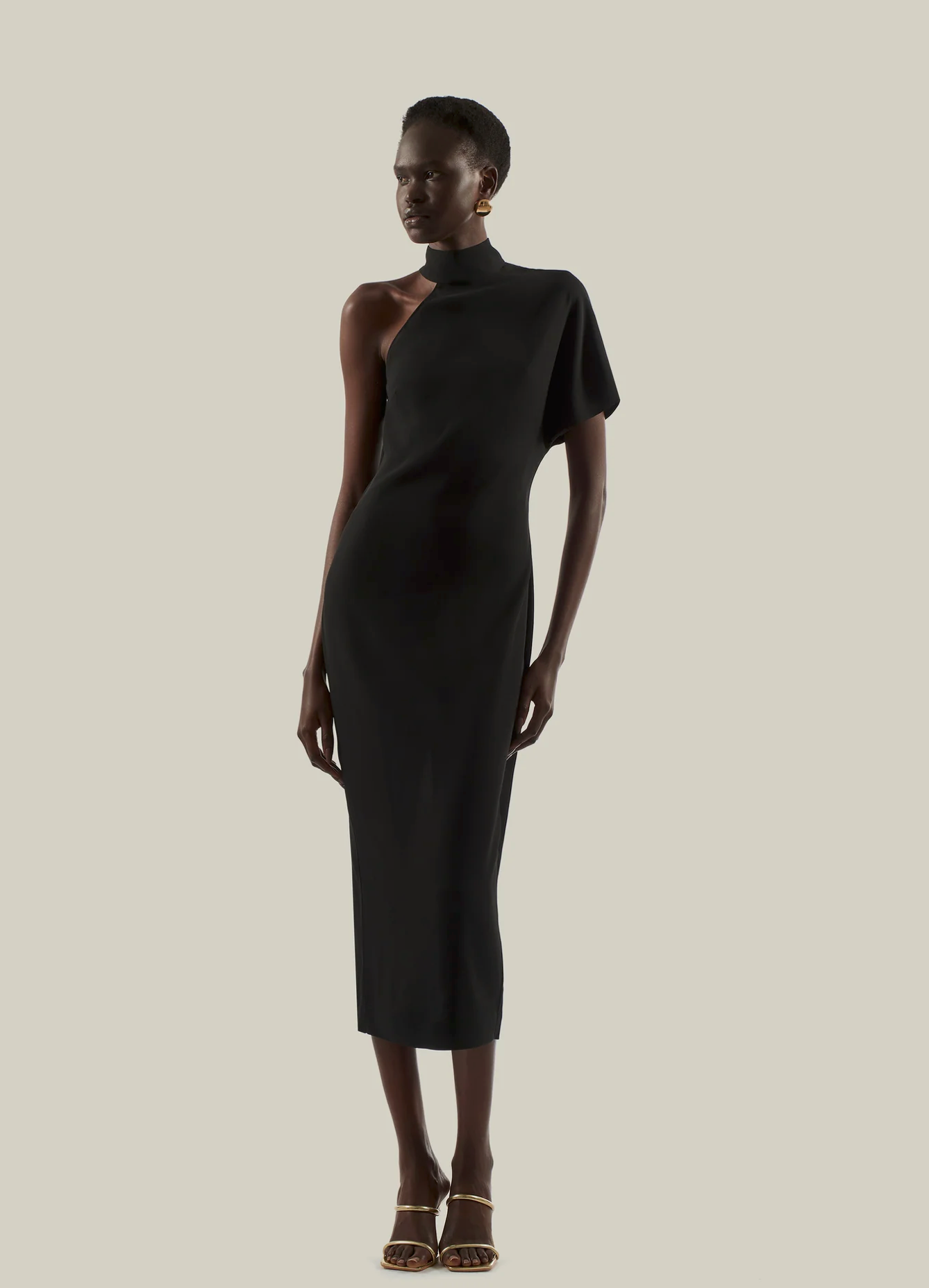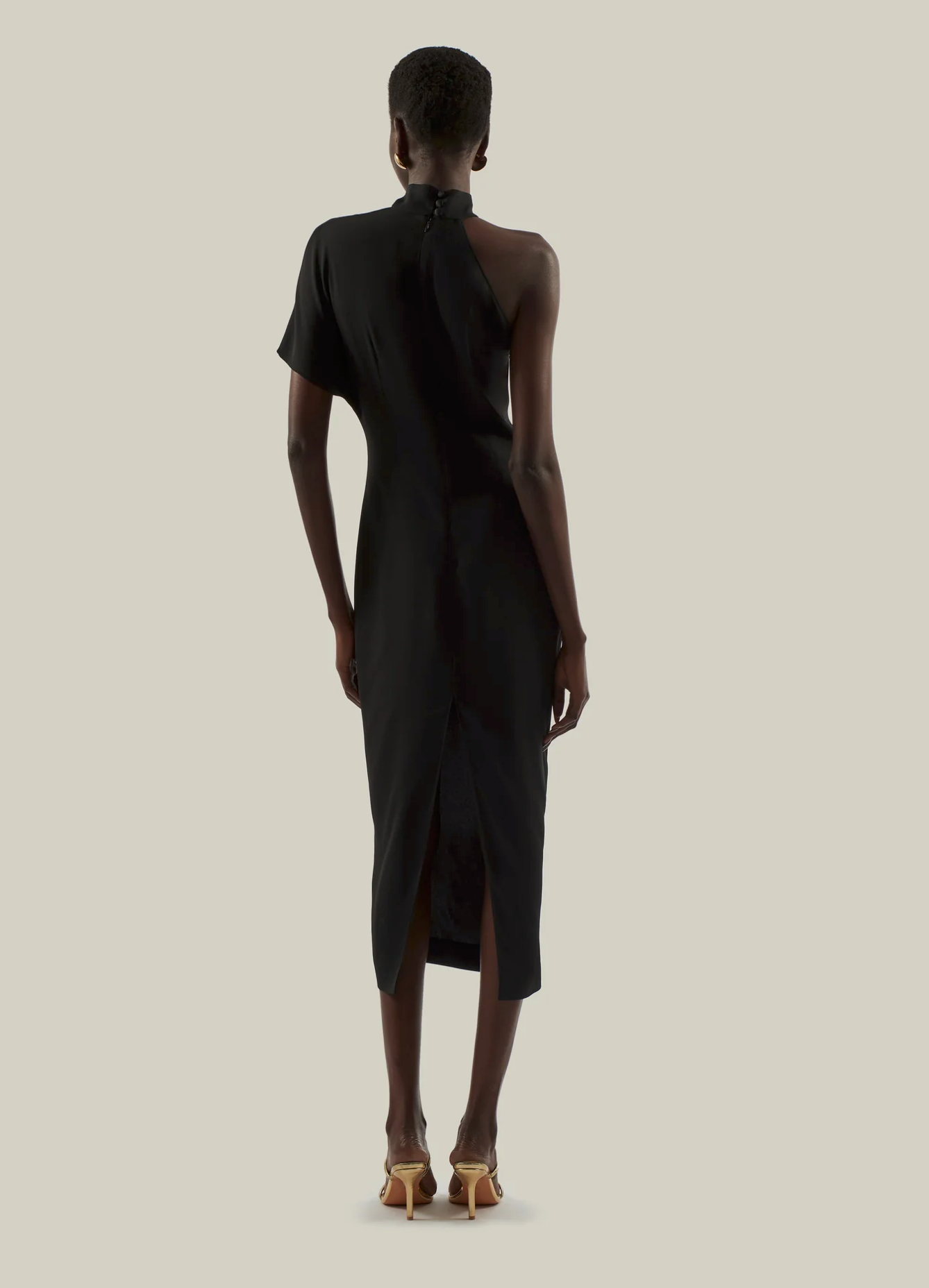 Cut from fluid crepe candy and designed with a striking asymmetrical silhouette.