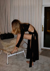 Cydney is captured also wearing The Rosie Silk Bra in Black by Nué.