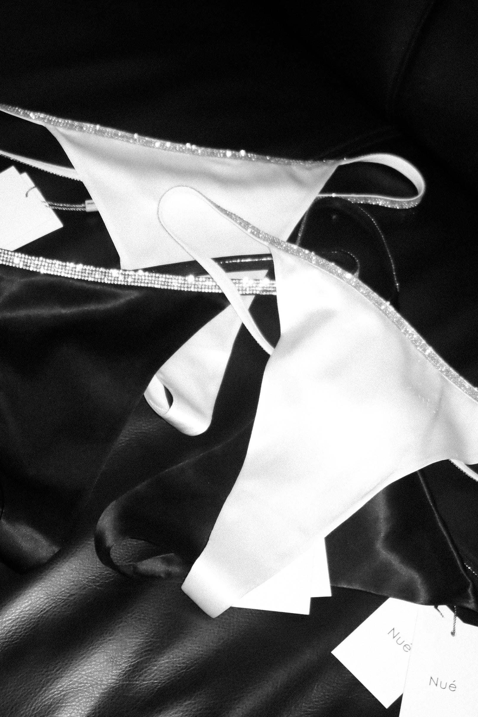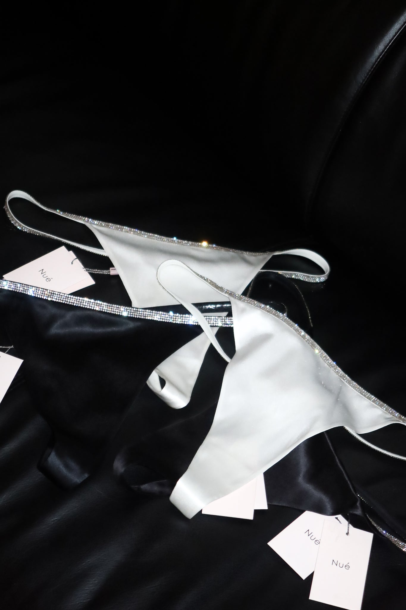 A silk thong is made from natural Italian silk and shaped into high-cut legs. It has slender silicone-based strap sides embellished with rhinestones. Matches with coordinating silk bra.