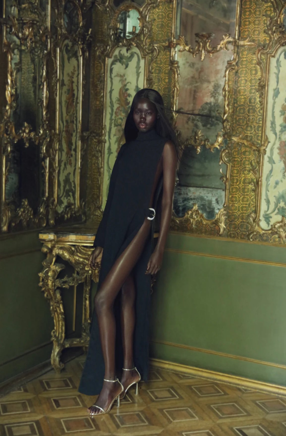 A statement piece defined by its essential lines and striking construction. The Michela Dress is cut from fluid crepe cady and designed with a high neckline, a single long sleeve, and a full-length open side that creates space for movement and layering. The opening is secured at the hip and features a crystal buckle, meticulously made in Italy. A bold yet refined design that invites styling freedom and offers a contemporary take on sensuality.